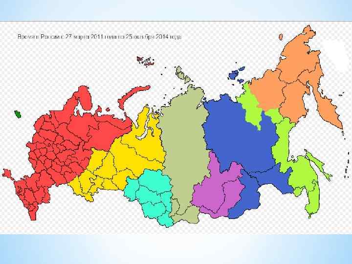 * 8 февраля 2011 года Дмитрий Медведев объявил о принятии им решения об отмене сезонного перевода часов, сформулировав это как «отмену перехода на зимнее время» . Последний раз стрелки часов были переведены на 1 час 27 марта 2011 года. 30 октября 2011 года стрелки часов уже не переводились. Другими словами, начиная с 27 марта 2011 года, Россия находится в часовых поясах с 3 -го по 12 -й, за исключением 5 -го. В частности, Москва, согласно закону, расположена в 4 -м часовом поясе (UTC+4). * Новый закон «Об исчислении времени» правительство РФ внесло в Государственную думу 3 марта 2011 года. Закон принят Госдумой в третьем (окончательном) чтении 20 мая 2011 года, одобрен Советом Федерации 25 мая и подписан президентом России Дмитрием Медведевым 3 июня. 6 июня он был официально опубликован и вступил в силу по истечении 60 дней после этой даты (5 августа 2011 года).