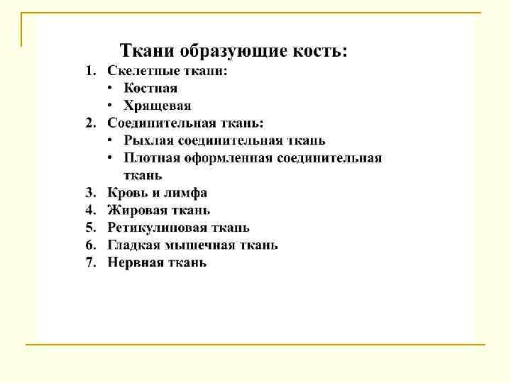 Классификация костей М. Г. Привеса I. Трубчатые кости. 1. Длинные (плечевая кость, кости предплечья, бедренная кость, кости голени). 2. Короткие (кости пясти, плюсны, фаланги пальцев). II. Губчатые кости. 1. Длинные (ребра, грудина). 2. Короткие (кости запястья, предплюсны, позвонки). 3. Сесамовидные. III. Плоские кости. 1. Кости свода черепа (лобная, теменная). 2. Кости поясов конечностей (лопатка, тазовая кость). IV. Смешанные кости. 1. Кости основания черепа. 2. Ключица.