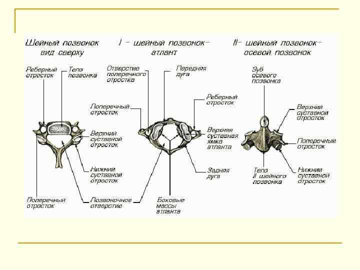 Шейные позвонки Главный групповой признак – отверстие в поперечном отростке (foramen transversarium). На концах поперечных отростков шейных позвонков находятся два бугорка – передний и задний (tuberculum anterius et posterius). По верхней поверхности поперечных отростков проходит борозда спинномозгового нерва (sulcus nervi spinalis), в которой располагается спинномозговой нерв. Второстепенные групповые признаки шейных позвонков: • тело относительно небольших размеров, эллипсовидной формы; • позвоночное отверстие относительно большое, треугольной формы; • остистые отростки относительно короткие, раздвоены на конце; • суставные отростки короткие, расположены косо, в плоскости, занимающей промежуточное положение между горизонтальной и фронтальной.