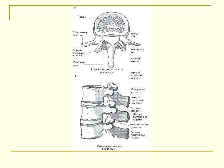 Позвонок (vertebra) n n Тело (corpus vertebrae) Дуга (arcus vertebrae) Ножки дуги позвонка (pedunculi arcus vertebrae) Позвоночное отверстие (foramen vertebrale)