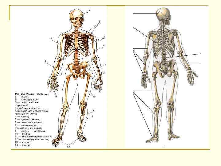 Скелет человека: функции n Механические функции: q q q n опора и крепление мышц (скелет поддерживает все другие органы, придаёт телу определённую форму и положение в пространстве); защита - образование полостей (черепная коробка защищает головной мозг, грудная клетка предохраняет сердце и лёгкие, а таз - мочевой пузырь, прямую кишку и другие органы); движение - подвижное соединение костей (скелет вместе с мышцами составляет двигательный аппарат, кости в этом аппарате выполняют пассивную роль - они являются рычагами, которые перемещаются в результате сокращения мышц). Биологические функции: q q q минеральный обмен; кроветворение; депонирование крови.
