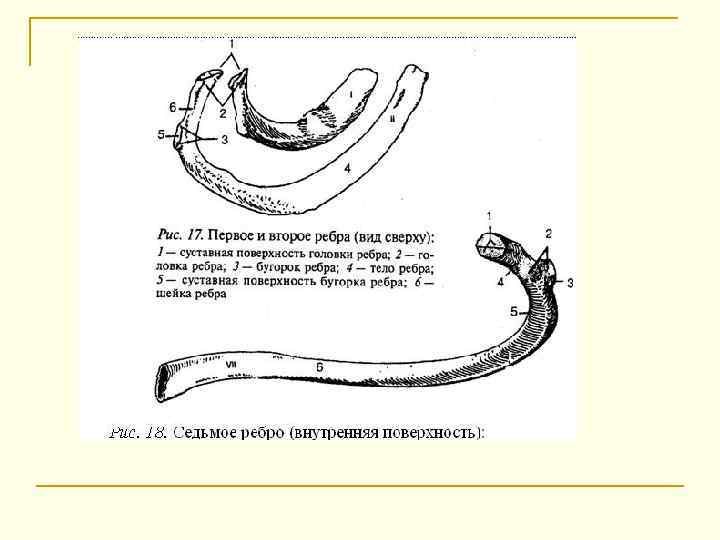Шейка ребра, collum costae, — наиболее суженная и округлая часть ребра, несет на верхнем крае гребень шейки ребра, crista colli costae (I и XII ребра этого гребня не имеют). На границе с телом у 10 верхних пар ребер на шейке имеется небольшой бугорок ребра, tuberculum costae, на котором находится суставная поверхность бугорка ребра, facies articularis tuberculi costae, сочленяющаяся с поперечной реберной ямкой соответствующего позвонка. Тело ребра имеет 2 поверхности: наружную (выпуклую) и внутреннюю (вогнутую). Эти поверхности ограничены двумя краями: верхний (закруглённый) и нижний (острый). На внутренней поверхности нижнего края проходит борозда, здесь лежат сосуды и нервы. 10 пар рёбер связаны хрящами с грудиной.