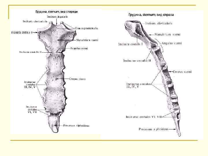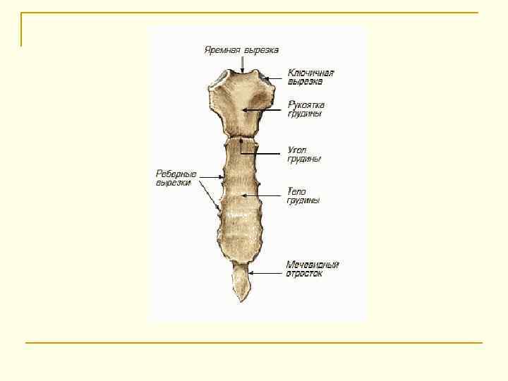 Грудина (sternum) — это непарная длинная плоская губчатая кость, состоящая из 3 частей: - рукоятки, - тела, - мечевидного отростка.
