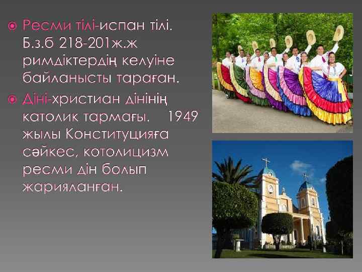 Атауы: Коста Рика Орналасқан жері: Орталық Америка Аумағы: 51 100 км² Жерінің көп бөлігін жанартаулар алып жатыр Халқының саны: 4, 328 000 адам Халқының 97% креолдар мен метистер, қалғанынегрлер.