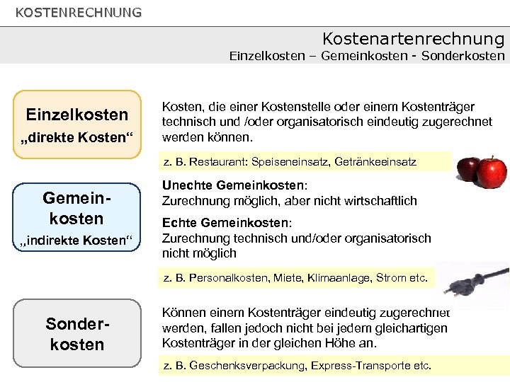 KOSTENRECHNUNG Kostenartenrechnung Einzelkosten – Gemeinkosten - Sonderkosten Einzelkosten „direkte Kosten“ Kosten, die einer Kostenstelle oder einem Kostenträger technisch und /oder organisatorisch eindeutig zugerechnet werden können. z. B. Restaurant: Speiseneinsatz, Getränkeeinsatz Gemeinkosten „indirekte Kosten“ Unechte Gemeinkosten: Zurechnung möglich, aber nicht wirtschaftlich Echte Gemeinkosten: Zurechnung technisch und/oder organisatorisch nicht möglich z. B. Personalkosten, Miete, Klimaanlage, Strom etc. Sonderkosten Können einem Kostenträger eindeutig zugerechnet werden, fallen jedoch nicht bei jedem gleichartigen Kostenträger in der gleichen Höhe an. z. B. Geschenksverpackung, Express-Transporte etc.