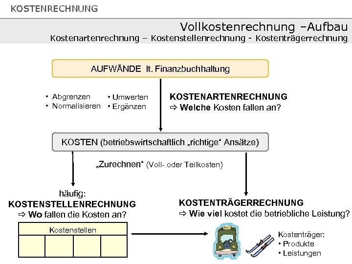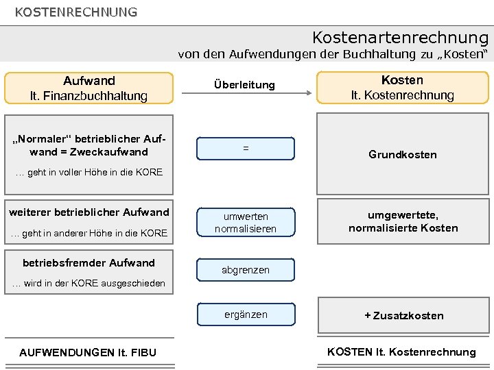 KOSTENRECHNUNG Kostenartenrechnung von den Aufwendungen der Buchhaltung zu „Kosten“ Kosten lt. Kostenrechnung Aufwand lt. Finanzbuchhaltung Überleitung „Normaler“ betrieblicher Aufwand = Zweckaufwand = Grundkosten umwerten normalisieren umgewertete, normalisierte Kosten … geht in voller Höhe in die KORE weiterer betrieblicher Aufwand … geht in anderer Höhe in die KORE betriebsfremder Aufwand abgrenzen … wird in der KORE ausgeschieden ergänzen AUFWENDUNGEN lt. FIBU + Zusatzkosten KOSTEN lt. Kostenrechnung