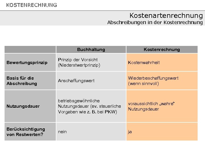KOSTENRECHNUNG Kostenartenrechnung Abschreibungen in der Kostenrechnung Buchhaltung Bewertungsprinzip Prinzip der Vorsicht (Niederstwertprinzip) Kostenwahrheit Basis für die Abschreibung Anschaffungswert Wiederbeschaffungswert (wenn sinnvoll) Nutzungsdauer betriebsgewöhnliche Nutzungsdauer (ev. steuerliche Vorgaben wie z. B. bei PKW) voraussichtlich „wahre“ Nutzungsdauer Berücksichtigung von Restwerten? nein ja