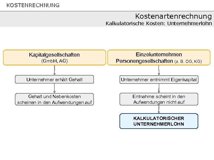 KOSTENRECHNUNG Kostenartenrechnung Kalkulatorische Kosten: Unternehmerlohn (Gmb. H, AG) Einzelunternehmen Personengesellschaften (z. B. OG, KG) Unternehmer erhält Gehalt Unternehmer entnimmt Eigenkapital Gehalt und Nebenkosten scheinen in den Aufwendungen auf Entnahme scheint in den Aufwendungen nicht auf Kapitalgesellschaften KALKULATORISCHER UNTERNEHMERLOHN