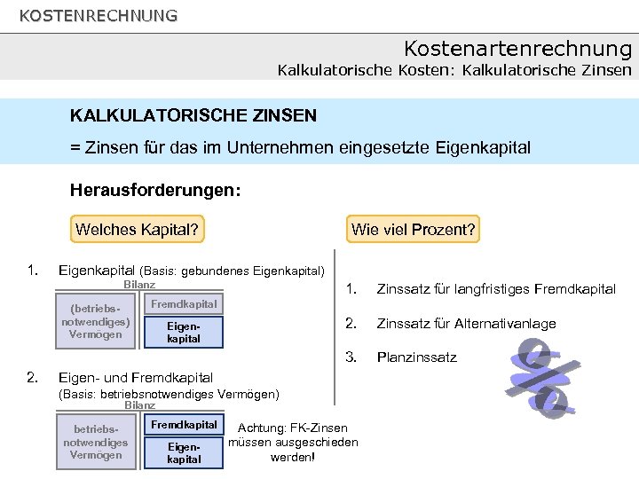 KOSTENRECHNUNG Kostenartenrechnung Kalkulatorische Kosten: Kalkulatorische Zinsen KALKULATORISCHE ZINSEN = Zinsen für das im Unternehmen eingesetzte Eigenkapital Herausforderungen: Welches Kapital? 1. Wie viel Prozent? Eigenkapital (Basis: gebundenes Eigenkapital) Bilanz 2. Zinssatz für langfristiges Fremdkapital 2. Zinssatz für Alternativanlage 3. (betriebsnotwendiges) Vermögen 1. Planzinssatz Fremdkapital Eigen- und Fremdkapital (Basis: betriebsnotwendiges Vermögen) Bilanz betriebsnotwendiges Vermögen Fremdkapital Eigenkapital Achtung: FK-Zinsen müssen ausgeschieden werden!