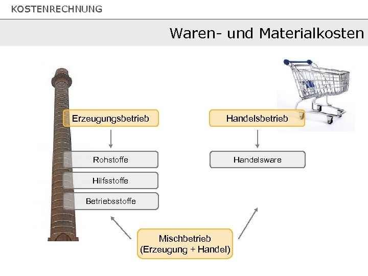 KOSTENRECHNUNG Waren- und Materialkosten Erzeugungsbetrieb Handelsbetrieb Rohstoffe Handelsware Hilfsstoffe Betriebsstoffe Mischbetrieb (Erzeugung + Handel)