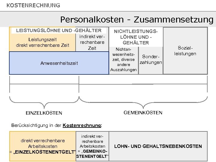 KOSTENRECHNUNG Personalkosten - Zusammensetzung LEISTUNGSLÖHNE UND -GEHÄLTER indirekt ver. Leistungszeit rechenbare direkt verrechenbare Zeit Anwesenheitszeit EINZELKOSTEN NICHTLEISTUNGSLÖHNE UND GEHÄLTER Nichtanwesenheits. Sonderzeit, diverse zahlungen andere Auszahlungen Sozialleistungen GEMEINKOSTEN Berücksichtigung in der Kostenrechnung: indirekt verrechenbare Arbeitskosten = „EINZELKOSTENENTGELT“ = „GEMEINKOSTENENTGELT“ LOHN- UND GEHALTSNEBENKOSTEN