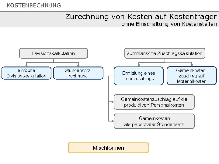 KOSTENRECHNUNG Zurechnung von Kosten auf Kostenträger ohne Einschaltung von Kostenstellen Divisionskalkulation einfache Divisionskalkulation Stundensatzrechnung summarische Zuschlagskalkulation Ermittlung eines Lohnzuschlags Gemeinkostenzuschlag auf Materialkosten Gemeinkostenzuschlag auf die produktiven Personalkosten Gemeinkosten als pauschaler Stundensatz Mischformen