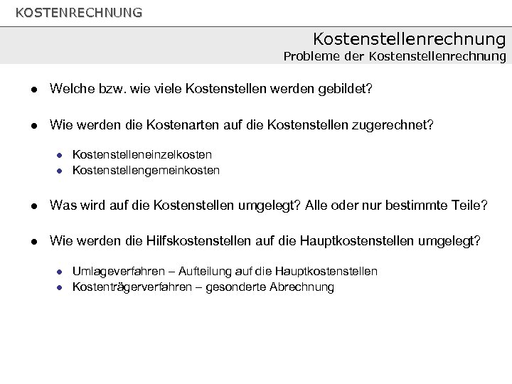 KOSTENRECHNUNG Kostenstellenrechnung Probleme der Kostenstellenrechnung l Welche bzw. wie viele Kostenstellen werden gebildet? l Wie werden die Kostenarten auf die Kostenstellen zugerechnet? l l Kostenstelleneinzelkosten Kostenstellengemeinkosten l Was wird auf die Kostenstellen umgelegt? Alle oder nur bestimmte Teile? l Wie werden die Hilfskostenstellen auf die Hauptkostenstellen umgelegt? l l Umlageverfahren – Aufteilung auf die Hauptkostenstellen Kostenträgerverfahren – gesonderte Abrechnung