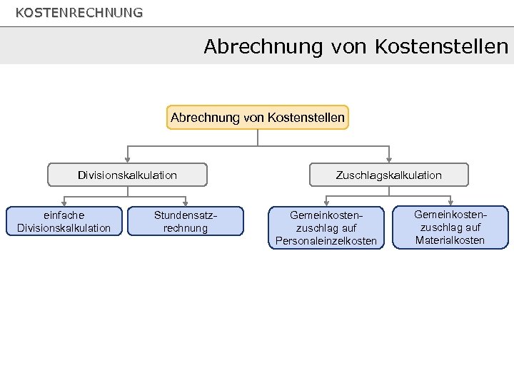 KOSTENRECHNUNG Abrechnung von Kostenstellen Divisionskalkulation einfache Divisionskalkulation Stundensatzrechnung Zuschlagskalkulation Gemeinkostenzuschlag auf Personaleinzelkosten Gemeinkostenzuschlag auf Materialkosten