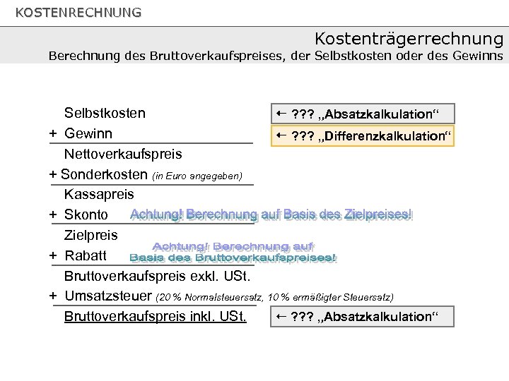 KOSTENRECHNUNG Kostenträgerrechnung Berechnung des Bruttoverkaufspreises, der Selbstkosten oder des Gewinns Selbstkosten ? ? ? „Absatzkalkulation“ + Gewinn ? ? ? „Differenzkalkulation“ Nettoverkaufspreis + Sonderkosten (in Euro angegeben) Kassapreis + Skonto Zielpreis + Rabatt Bruttoverkaufspreis exkl. USt. + Umsatzsteuer (20 % Normalsteuersatz, 10 % ermäßigter Steuersatz) ? ? ? „Absatzkalkulation“ Bruttoverkaufspreis inkl. USt.