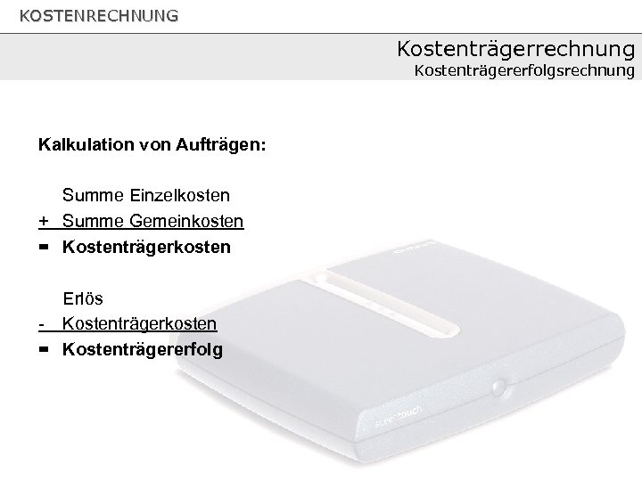 KOSTENRECHNUNG Kostenträgerrechnung Kostenträgererfolgsrechnung Kalkulation von Aufträgen: Summe Einzelkosten + Summe Gemeinkosten = Kostenträgerkosten Erlös - Kostenträgerkosten = Kostenträgererfolg