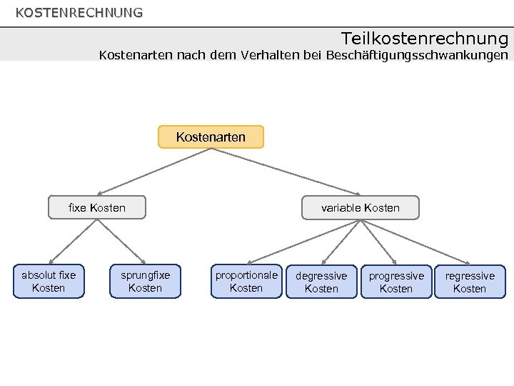 KOSTENRECHNUNG Teilkostenrechnung Kostenarten nach dem Verhalten bei Beschäftigungsschwankungen Kostenarten fixe Kosten absolut fixe Kosten sprungfixe Kosten variable Kosten proportionale Kosten degressive Kosten progressive Kosten regressive Kosten
