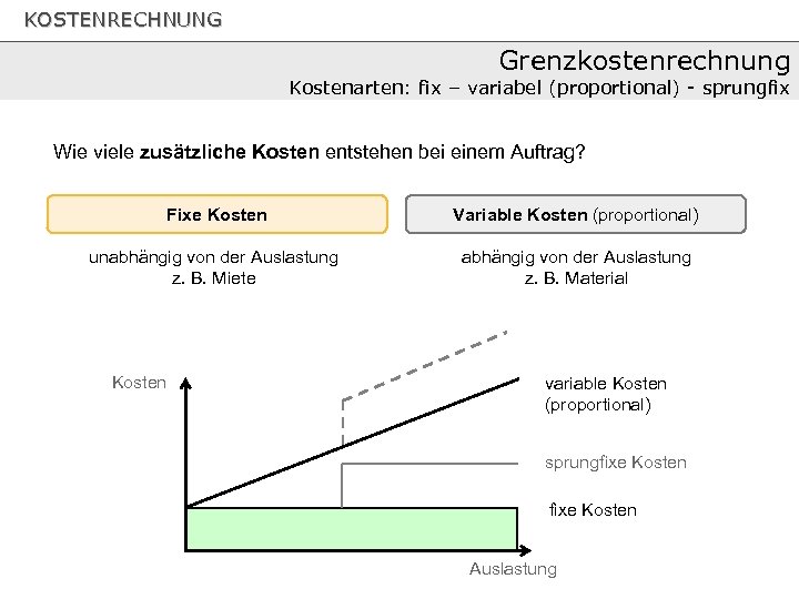 KOSTENRECHNUNG Grenzkostenrechnung Kostenarten: fix – variabel (proportional) - sprungfix Wie viele zusätzliche Kosten entstehen bei einem Auftrag? Fixe Kosten Variable Kosten (proportional) unabhängig von der Auslastung z. B. Miete abhängig von der Auslastung z. B. Material Kosten variable Kosten (proportional) sprungfixe Kosten Auslastung