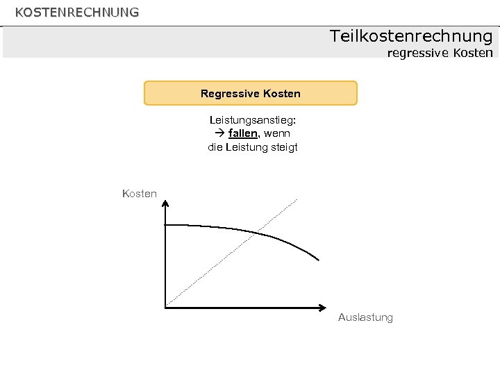 KOSTENRECHNUNG Teilkostenrechnung regressive Kosten Regressive Kosten Leistungsanstieg: fallen, wenn die Leistung steigt Kosten Auslastung