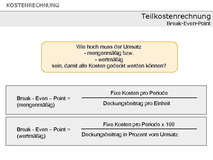 KOSTENRECHNUNG Teilkostenrechnung Break-Even-Point Wie hoch muss der Umsatz - mengenmäßig bzw. - wertmäßig sein, damit alle Kosten gedeckt werden können? Break - Even – Point = (mengenmäßig) Break - Even – Point = (wertmäßig) Fixe Kosten pro Periode Deckungsbeitrag pro Einheit Fixe Kosten pro Periode x 100 Deckungsbeitrag in Prozent vom Umsatz