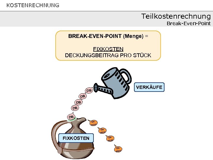 KOSTENRECHNUNG Teilkostenrechnung Break-Even-Point BREAK-EVEN-POINT (Menge) = FIXKOSTEN DECKUNGSBEITRAG PRO STÜCK VERKÄUFE DB DB DB Gewinn FIXKOSTEN Gewinn
