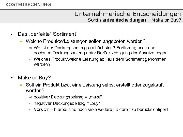 KOSTENRECHNUNG Unternehmerische Entscheidungen Sortimentscheidungen – Make or Buy? § Das „perfekte“ Sortiment § Welche Produkte/Leistungen sollen angeboten werden? Wo ist der Deckungsbeitrag am höchsten? Sortierung nach dem höchsten Deckungsbeitrag unter Berücksichtigung der Absatzmengen. Welches Produkt/welche Leistung soll aus dem Sortiment genommen werden? § Make or Buy? § Soll ein Produkt bzw. eine Leistung selbst erstellt oder zugekauft werden? positiver Deckungsbeitrag = „make“ negativer Deckungsbeitrag = „buy“ Vorsicht – hierbei sind noch viele weitere Faktoren zu berücksichtigen!