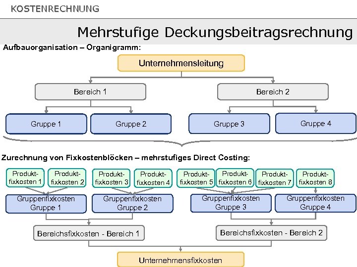KOSTENRECHNUNG Mehrstufige Deckungsbeitragsrechnung Aufbauorganisation – Organigramm: Unternehmensleitung Bereich 1 Gruppe 1 Bereich 2 Gruppe 4 Gruppe 3 Zurechnung von Fixkostenblöcken – mehrstufiges Direct Costing: Produktfixkosten 1 Produktfixkosten 2 Gruppenfixkosten Gruppe 1 Produktfixkosten 3 Produktfixkosten 4 Gruppenfixkosten Gruppe 2 Bereichsfixkosten - Bereich 1 Produktfixkosten 5 fixkosten 6 fixkosten 7 Gruppenfixkosten Gruppe 3 Produktfixkosten 8 Gruppenfixkosten Gruppe 4 Bereichsfixkosten - Bereich 2 Unternehmensfixkosten