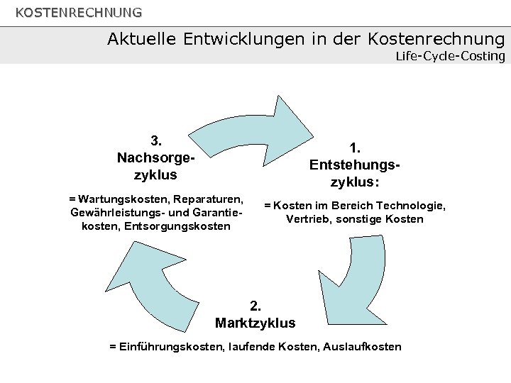 KOSTENRECHNUNG Aktuelle Entwicklungen in der Kostenrechnung Life-Cycle-Costing 3. Nachsorgezyklus 1. Entstehungszyklus: = Wartungskosten, Reparaturen, Gewährleistungs- und Garantiekosten, Entsorgungskosten = Kosten im Bereich Technologie, Vertrieb, sonstige Kosten 2. Marktzyklus = Einführungskosten, laufende Kosten, Auslaufkosten