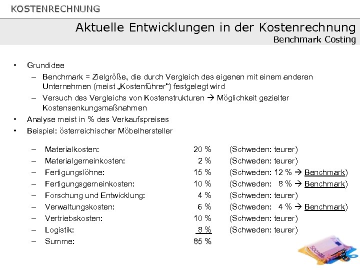 KOSTENRECHNUNG Aktuelle Entwicklungen in der Kostenrechnung Benchmark Costing • • • Grundidee – Benchmark = Zielgröße, die durch Vergleich des eigenen mit einem anderen Unternehmen (meist „Kostenführer“) festgelegt wird – Versuch des Vergleichs von Kostenstrukturen Möglichkeit gezielter Kostensenkungsmaßnahmen Analyse meist in % des Verkaufspreises Beispiel: österreichischer Möbelhersteller – – – – – Materialkosten: Materialgemeinkosten: Fertigungslöhne: Fertigungsgemeinkosten: Forschung und Entwicklung: Verwaltungskosten: Vertriebskosten: Logistik: Summe: 20 % 2% 15 % 10 % 4% 6% 10 % 8% 85 % (Schweden: teurer) (Schweden: 12 % Benchmark) (Schweden: 8 % Benchmark) (Schweden: teurer) (Schweden: 4 % Benchmark) (Schweden: teurer)