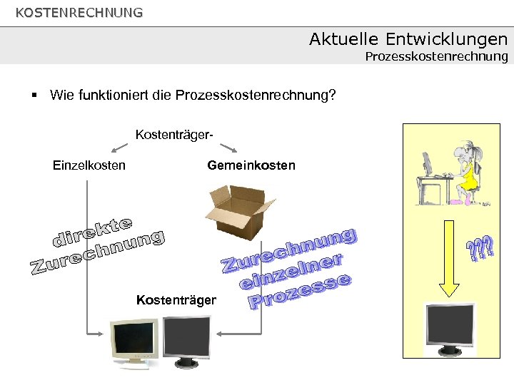 KOSTENRECHNUNG Aktuelle Entwicklungen Prozesskostenrechnung § Wie funktioniert die Prozesskostenrechnung? Kostenträger. Einzelkosten Gemeinkosten Kostenträger