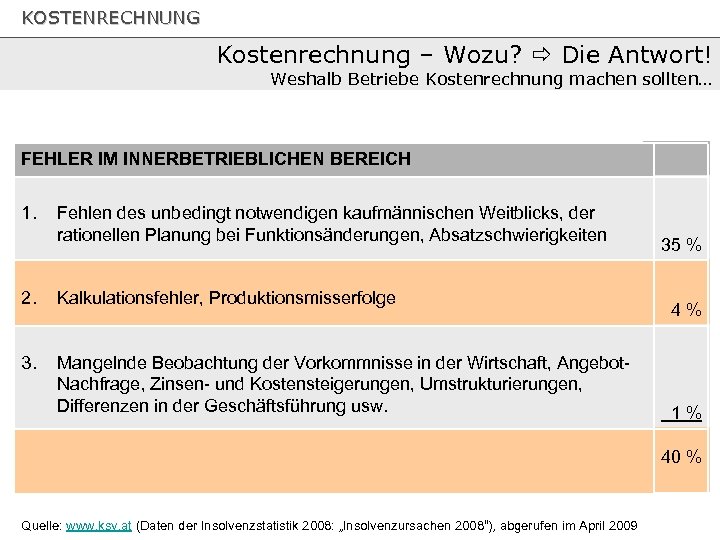 KOSTENRECHNUNG Kostenrechnung – Wozu? Die Antwort! Weshalb Betriebe Kostenrechnung machen sollten… FEHLER IM INNERBETRIEBLICHEN BEREICH 1. Fehlen des unbedingt notwendigen kaufmännischen Weitblicks, der rationellen Planung bei Funktionsänderungen, Absatzschwierigkeiten 2. Kalkulationsfehler, Produktionsmisserfolge 3. Mangelnde Beobachtung der Vorkommnisse in der Wirtschaft, Angebot. Nachfrage, Zinsen- und Kostensteigerungen, Umstrukturierungen, Differenzen in der Geschäftsführung usw. 35 % 4% 1% 40 % Quelle: www. ksv. at (Daten der Insolvenzstatistik 2008: „Insolvenzursachen 2008“), abgerufen im April 2009
