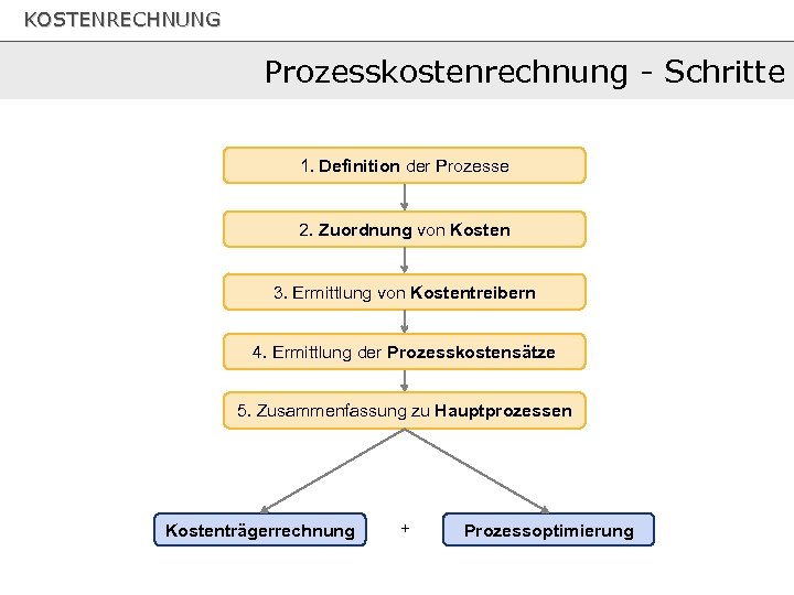 KOSTENRECHNUNG Prozesskostenrechnung - Schritte 1. Definition der Prozesse 2. Zuordnung von Kosten 3. Ermittlung von Kostentreibern 4. Ermittlung der Prozesskostensätze 5. Zusammenfassung zu Hauptprozessen Kostenträgerrechnung + Prozessoptimierung