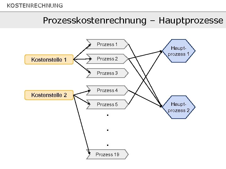 KOSTENRECHNUNG Prozesskostenrechnung – Hauptprozesse Prozess 1 Kostenstelle 1 Prozess 2 Hauptprozess 1 Prozess 3 Kostenstelle 2 Prozess 4 Prozess 5 . . . Prozess 19 Hauptprozess 2