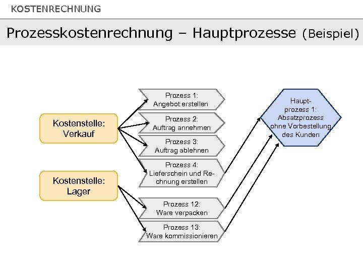 KOSTENRECHNUNG Prozesskostenrechnung – Hauptprozesse (Beispiel) Prozess 1: Angebot erstellen Kostenstelle: Verkauf Kostenstelle: Lager Prozess 2: Auftrag annehmen Prozess 3: Auftrag ablehnen Prozess 4: Lieferschein und Rechnung erstellen Prozess 12: Ware verpacken Prozess 13: Ware kommissionieren Hauptprozess 1: Absatzprozess ohne Vorbestellung des Kunden