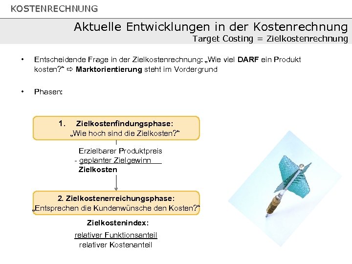 KOSTENRECHNUNG Aktuelle Entwicklungen in der Kostenrechnung Target Costing = Zielkostenrechnung • Entscheidende Frage in der Zielkostenrechnung: „Wie viel DARF ein Produkt kosten? “ Marktorientierung steht im Vordergrund • Phasen: 1. Zielkostenfindungsphase: „Wie hoch sind die Zielkosten? “ Erzielbarer Produktpreis - geplanter Zielgewinn Zielkosten 2. Zielkostenerreichungsphase: „Entsprechen die Kundenwünsche den Kosten? “ Zielkostenindex: relativer Funktionsanteil relativer Kostenanteil