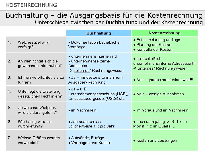 KOSTENRECHNUNG Buchhaltung – die Ausgangsbasis für die Kostenrechnung Unterschiede zwischen der Buchhaltung und der Kostenrechnung Buchhaltung Kostenrechnung Welches Ziel wird verfolgt? Dokumentation betrieblicher Vorgänge Entscheidungsgrundlage Planung der Kosten Kontrolle der Kosten 2. An wen richtet sich die gewonnene Information? unternehmensinterne und unternehmensexterne Adressaten „externes“ Rechnungswesen ausschließlich unternehmensinterne Adressaten!!! „internes“ Rechnungswesen 3. Ist man verpflichtet, sie zu führen? Ja – mindestens Einnahmen. Ausgaben-Rechnung Nein – jedoch empfehlenswert!!! 4. Unterliegt die Erstellung gesetzlichen Richtlinien? Ja – z. B. Unternehmensgesetzbuch (UGB), Umsatzsteuergesetz (USt. G) etc. Nein – wenige Ausnahmen 5. Zu welchem Zeitpunkt wird sie durchgeführt? im Nachhinein im Voraus und im Nachhinein 6. Wie häufig wird sie durchgeführt? Jahresabschluss: üblicherweise 1 x pro Jahr auch unterjährig, z. B. 1 x im Monat, 1 x im Quartal… 7. Welche Größen werden verwendet? Aufwände, Erträge Vermögen und Kapital Kosten und Leistungen 1.