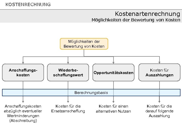 KOSTENRECHNUNG Kostenartenrechnung Möglichkeiten der Bewertung von Kosten Anschaffungskosten Wiederbeschaffungswert Opportunitätskosten Kosten für Auszahlungen Berechnungsbasis Anschaffungskosten abzüglich eventueller Wertminderungen (Abschreibung) Kosten für die Ersatzanschaffung Kosten für einen alternativen Nutzen Kosten für die darauf folgende Auszahlung