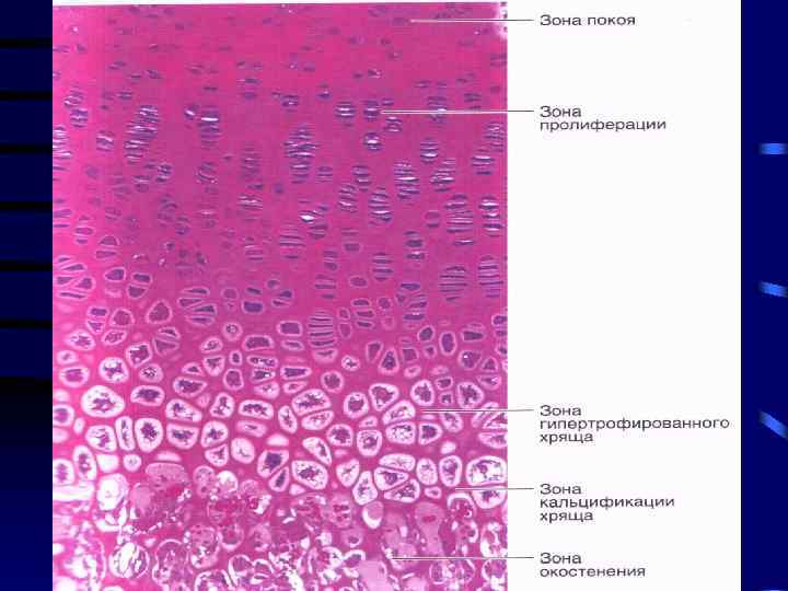 • В метаэпифизарном хряще выделяются 3 зоны : • 1. пограничная (зона покоя)- расположена со стороны эпифиза – состоит из округлых клеток и единичных изогенных групп , которые соединяют хрящевую пластинку с костью • 2 (ЗОНА ПРОЛИФЕРАЦИИ) столбчатых клеток, состоит из делящихся хондробластов, образующих колонки. • 3 ( зона гипертрофированного хряща) пузырчатых клеток – в этих клетках происходит накопление воды, вакуолизация и их разрушение, на место погибших хондроцитов врастают капилляры и остеобласты и начинается формирование остеонов.