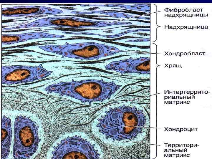 • Этапы дифференцировки: • • • Увеличение рибосом, появление г. ЭПС Синтез коллагена Появление гладкой ЭПС Синтез хондроитинсульфатов Появление базофилии в клетках, округление их и увеличение в размерах • Синтез хондробластами межклеточного вещества хрящевой ткани, которая замуровывает клетки • В полостях клетки делятся и продолжают синтезировать межклеточное вещество и образуются изогенные группы