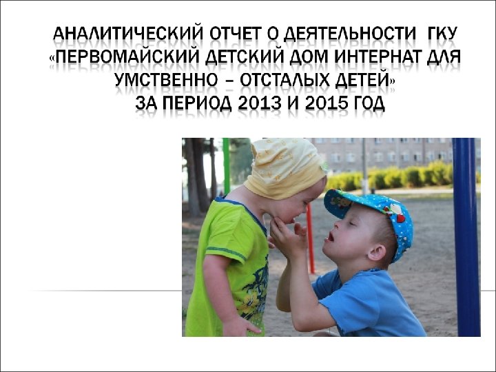 Костромское областное государственное казенное учреждение социального обслуживания «Первомайский детский дом – интернат для умственно отсталых детей» - это медико-социальное учреждение, которое планово рассчитано на 120 детей и подростков в возрасте от 4 до 18 лет. Воспитанниками детского дома – интерната являются дети-сироты, дети, оставшиеся без попечения родителей, попавшие в трудную жизненную ситуации, требующие особой поддержки, заботы и защиты. Основная цель детского дома-интерната – осуществление комплексной медико-психологопедагогической реабилитации на основе инновационных методов обучения и воспитания, подготовка детей и подростков к труду для их последующей интеграции в современное общество. Приоритетными направлениями деятельности детского дома-интерната являются: Трудовое обучение и воспитание Спортивно-оздоровительная работа; Культурно-досуговая деятельность и духовно-нравственное воспитание Духовно-нравственное воспитание; Медицинская реабилитация; Накоплен достаточно большой опыт реабилитации детей с особенностями в развитии, опирающийся на новую стратегию отношения к детям-инвалидам, с учетом социально-экономических реформ государства. За последнее время значительно качественно улучшилась материально-техническая база учреждения; материально-бытовое, медицинское, культурное обслуживание детей, создаются условия для их обучения, воспитания, социально-бытовой реабилитации, благоустраивается территория детского дома-интерната.