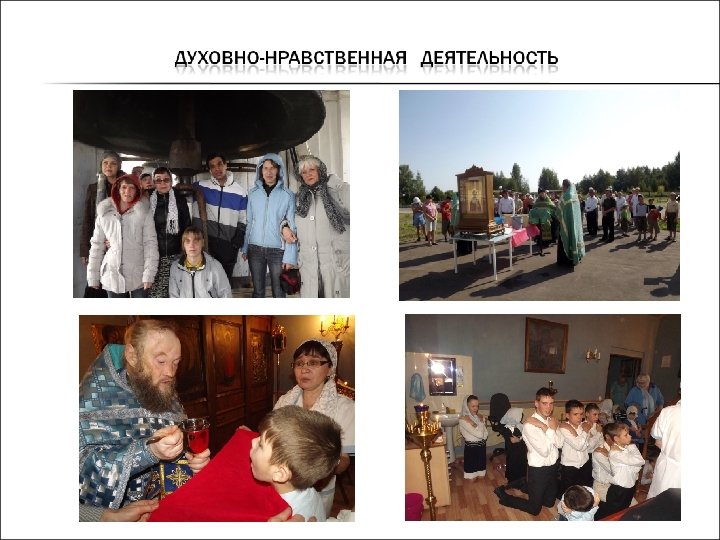 С 2012 года в детском доме ведется работа по проэкту «Дорога к храму» . Духовно-нравственное воспитание должно способствовать развитию и становлению личности инвалида, всех его духовных и физических сил его эстетических способностей; вести к новому мироощущению, мировоззрению, основанному на признании общечеловеческих ценностей в качестве приоритетных в жизни. Формы работы, использованные на занятиях. 1. 2. 3. Классные формы работы. Интегрированные уроки. Уроки – путешествия в историю. Урок – игра. Внеклассные формы работы. 1. Посещение Храма, участие в Богослужении; 2. Встречи со священнослужителями. 3. Просмотр православных фильмов и мультфильмов; 4. Рождественские чтения; 5. Участие в творческих выставках, концертах и фестивалях; 6. Паломнические поездки по Святым места;