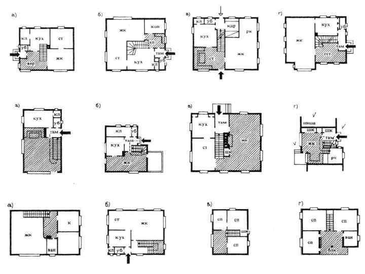 Схема взаимосвязи помещений жилого дома. Прихожая расположена между комнатами дневного пребывания и спальнями, со входом в кухню и уборную (ванную). Прихожая отделена от спален; однако из спален можно пройти в прихожую через кухню и ванную. Прихожая отделяет кухню от ванной; возможен проход в спальни через подсобные помещения. Ванная между спальнями; из кухни можно пройти в любое помещение дома. Открытая одномаршевая лестница требует большой площади коридора; применяется только в больших домах. Одномаршевая лестница в стенах между жилыми и подсобными помещениями занимает минимальную площадь. Ход в подвал из подсобного помещения по лестнице с забежными ступенями. Экономичная планировка первого и второго этажа с применением лестницы с забежными ступенями.