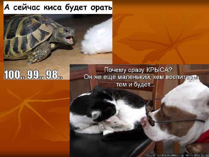 Учите детей любить животных, а не быть животными n Откуда берутся дети, кидающие камни в бездомных котят? Втыкающие в них палки? Играющие ими в футбол? Я хожу в парк со своим котом и понимаю, что все идет от родителей. Детям, желающим погладить моего котенка одни родители говорят "погладить, потихоньку, чтобы ему было приятно", другие "фу, отойти, не трогай его", причем говорят с таким пренебрежением. В таком случае я говорю своему котенку "отойди от этой семейки, они наверняка не привиты, подхватишь от них еще что-нибудь". Учите детей любить животных, а не быть животными.