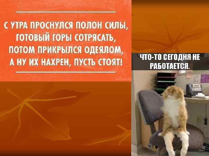 n Каждое утро я говорю себе: «Подъем, красотка, нас ждут великие дела!» , но внутренний голос шепчет, что если ждут, значит, любят, а если любят, то подождут. . . ))
