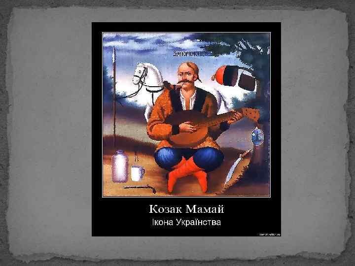 Козака Мамая на таких картинах завжди малювали з кобзою, що є символом співучої душі народу. Кінь на картині символізував народну волю, дуб — його могутність. Часто на малюнках ми бачимо зображення списа з прапорцем, козацького штофа і чарки. Це були речі, пов'язані зі смертю козака — спис ставили на місці поховання, штоф і чарку клали в могилу — вони нагадували про скороминущість життя та козацьку долю, в якій загроза смерті в бою була повсякденною реальністю.