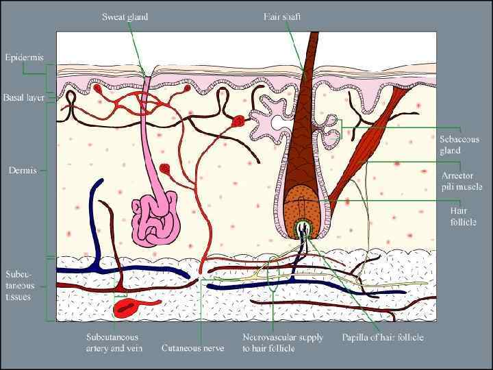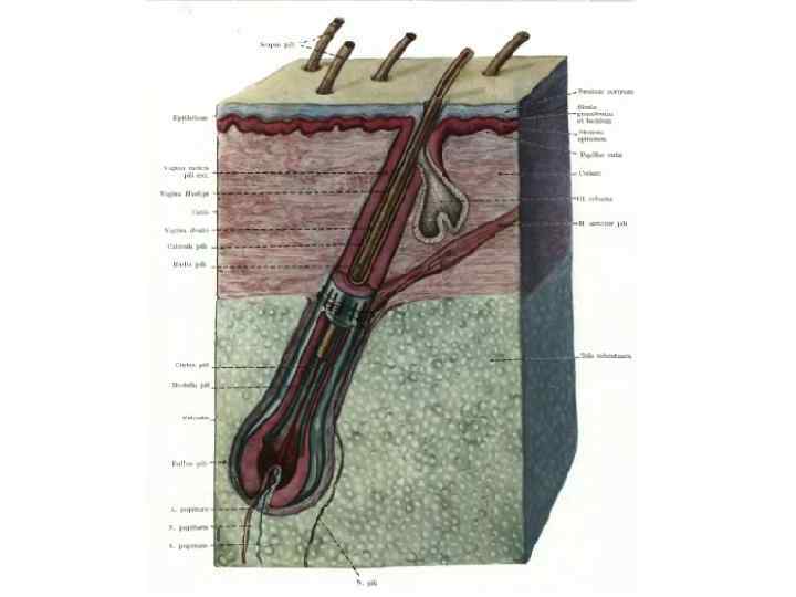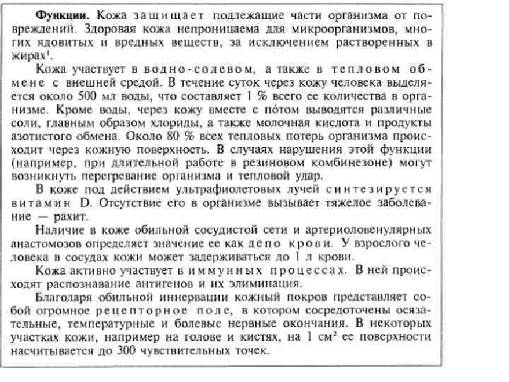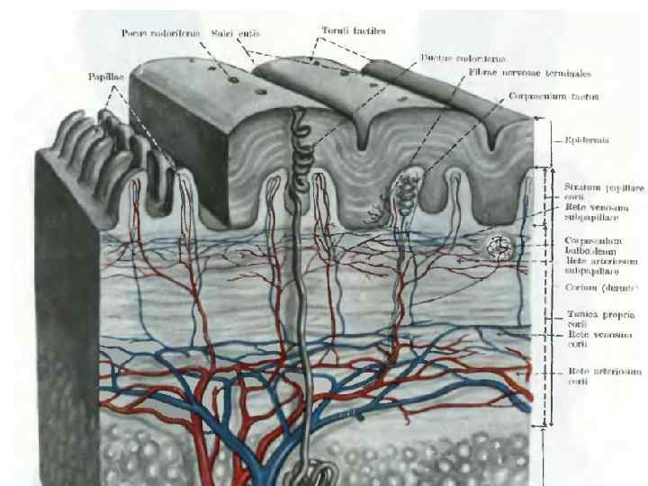 Функции кожи • Защитная • Участие в водно-солевом обмене (за сутки выделяется 500 мл жидкости =1%) • Тепловой обмен с внешней средой (80% тепловых потерь) • Синтез витамина D • Депо крови (до 1 л) • Участие в иммунных процессах • Рецепция (болевая, температурная, болевая)