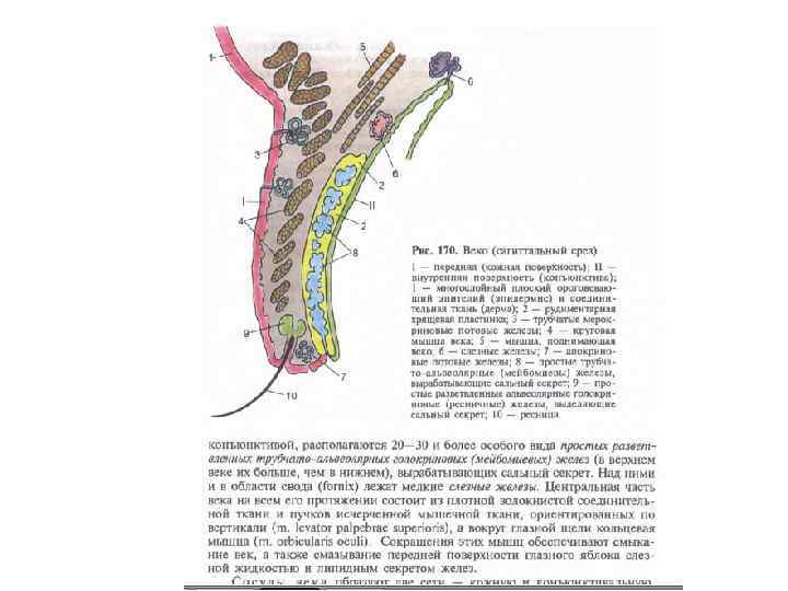 1 – базальный слой 2 – меланоцит 3 – шиповатый слой 4 – зернистый слой 5 – блестящий слой 6 – роговой слой 7 – базальная мембрана 8 – сосочковый слой 9 – сетчатый слой 10 – концевой отдел потовой железы
