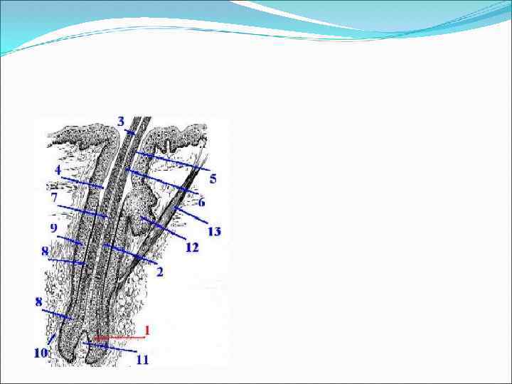 Строение кожи Дерма: Сосочковый - из рыхлой неоформленной соединительной ткани сетчатый - из плотной неоформленной соединительной ткани. Производные кожи потовые железы; Волосы сальные желёзы