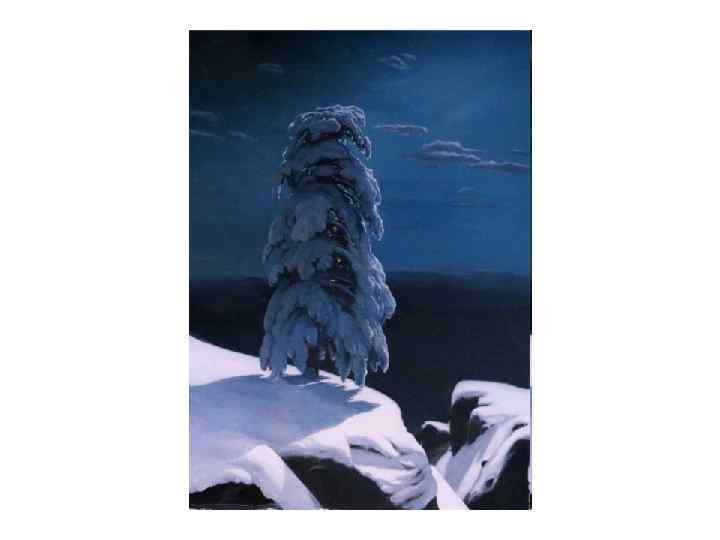 • И. Шишкин На севере диком. Вольный перевод стихотворения Г. Гейне "Ein Fichtenbaum steht einsam" ("Сосна стоит одиноко") из сборника "Buch der Lieder" ("Книга песен") (1827). Перевод известен в двух редакциях, весьма далёких от немецкого источника. В них обеих изменён смысл оригина. Лермонтов не принял во внимание существенных для Гейне грамматических родовых различий: в немецком языке "сосна" - мужского рода, "пальма" - женского. Поэтому стихотворение Лермонтова написано не о разлуке влюблённых, как у Гейне, а о трагедии одиночества, непреодолимой разобщённости людей. На севере диком стоит одиноко На голой вершине сосна, И дремлет, качаясь, и снегом сыпучим Одета, как ризой, она. И снится ей все, что в пустыне далекой, В том крае, где солнца восход, Одна и грустна на утесе горючем Прекрасная пальма растет.