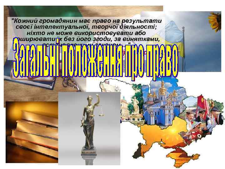 "Кожний громадянин має право на результати своєї інтелектуальної, творчої діяльності; ніхто не може використовувати або поширювати їх без його згоди, за винятками, встановленими законом. . . " Конституція України, cm. 54.